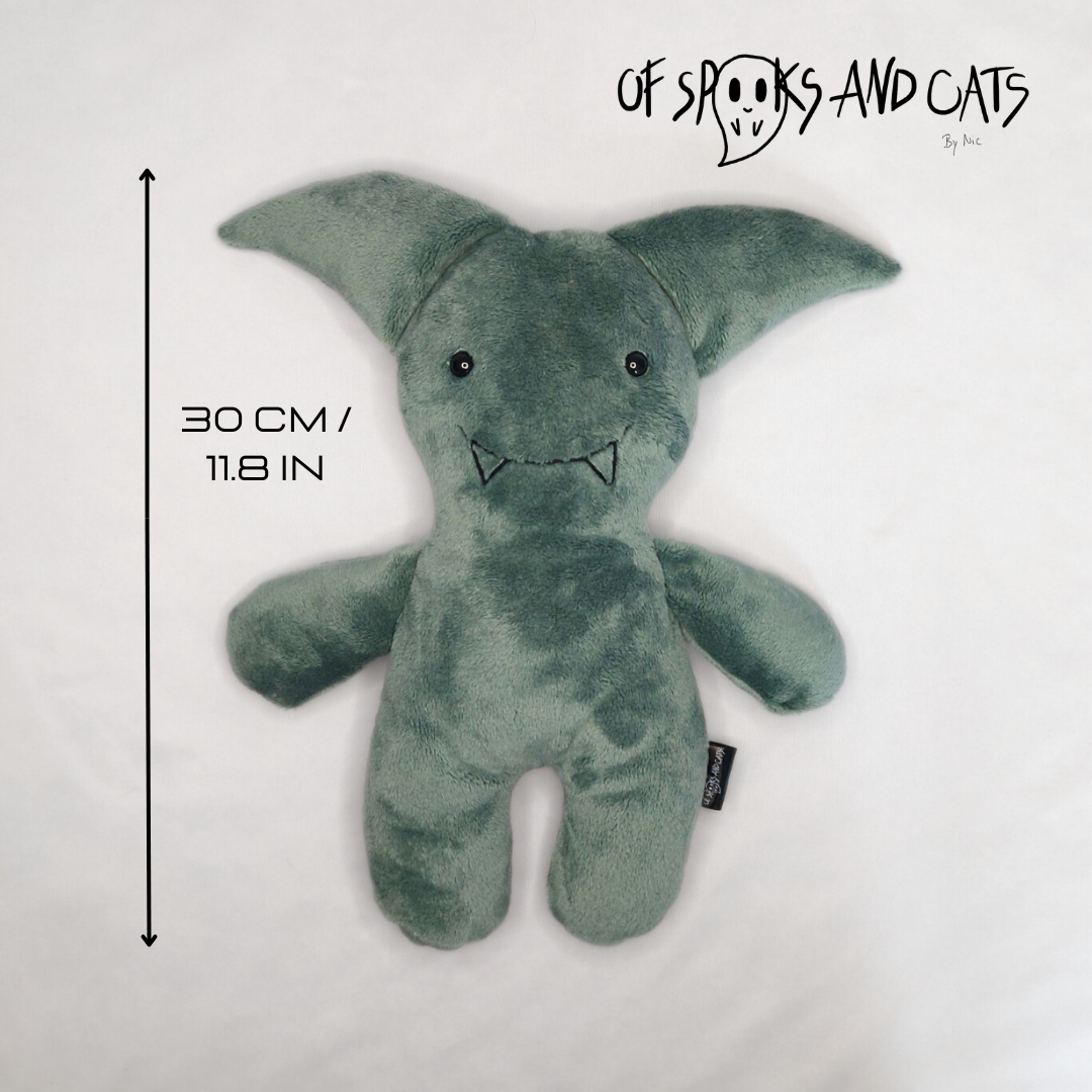 Jorn ist 30cm groß und aus einem super weichen grünen Plüschstoff.