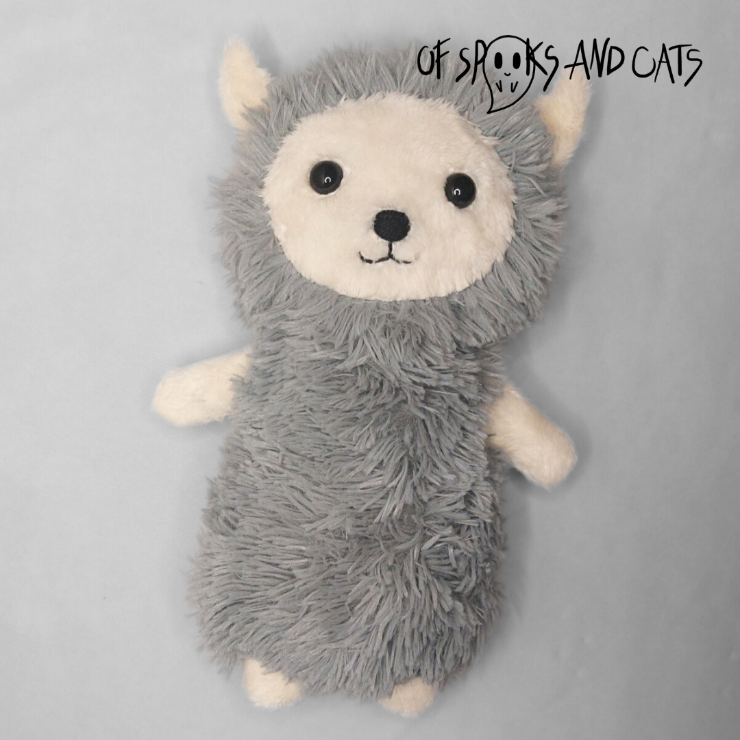 Toni ist ca. 25cm groß und aus einem langflorigen grauen Plüschstoff.